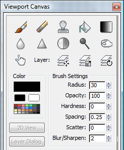 This initial section describes the controls on the upper portion of the Viewport Canvas dialog: painting tools, brush and color settings, and buttons for opening 2D View and the Layer dialog. The remaining controls are available from separate rollouts on the dialog and are described in Additional Viewport Canvas Rollouts.