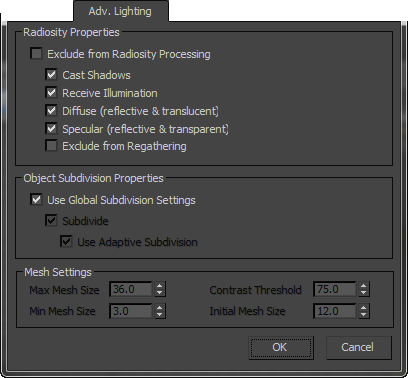 These settings are available only when Use Global Subdivision Settings (see preceding) is off and Subdivide is on. If Use Adaptive Subdivision is on, only Max Mesh Size is available.