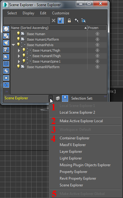 - List of all global Scene Explorers, as defined by the corresponding files, such as those you save when you make local Scene Explorers global. The illustration shows the default global Scene Explorers installed with