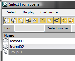 Group names are similar to object names, except that they’re carried by the group object. In lists like the one in the Selection Floater, group names appear in square brackets. For example: [Group01]. In Scene Explorer and related dialogs, the square brackets enclose the group object icon instead.