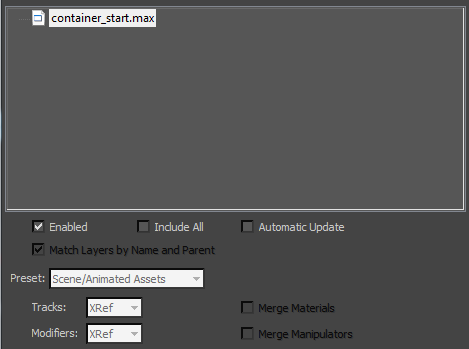 - Merge Combines all objects' externally referenced transform controllers from the source file into the master file. This means that the transform controllers will be loaded in the master file but will then no longer have a live connection with the source file. This is useful if you don't require the live connection, and want to alter the transform controllers in the master scene without losing your edits upon Update.