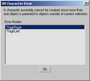 Any or all members of the character assembly can be linked to a single object outside the assembly, but no more than one. For example, ThighLeft and ThighRight, which are both part of the assembly, can both be linked to Pelvis, which is not part of the assembly. However, if ThighLeft and ThighRight are each linked to different objects outside the assembly, the creation of the assembly will fail, and will show the following error message: