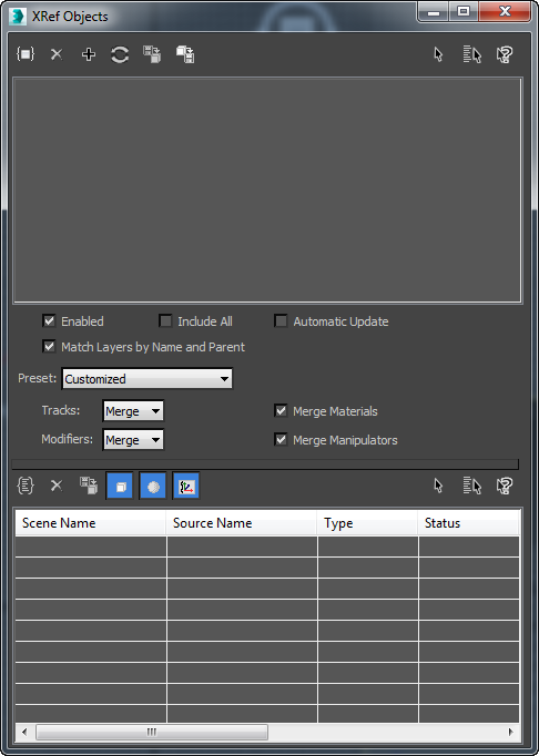 The XRef Objects dialog provides the interface for loading XRef entities into your master scene (the scene where you create the XRefs) from a source scene (the scene file that contains the entities that you want to externally reference). XRef entities can be XRef objects, transform controllers, materials, and manipulators. An XRef record can be made up of one or more XRef entities.