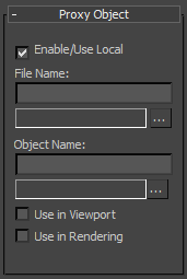 When you've selected an XRef object in a scene, the Proxy Object rollout appears along with the XRef Object rollout on the Modify panel. Use these controls to specify a low-resolution object to replace the original XRef object for easier handling in the viewports, and optionally for test rendering.