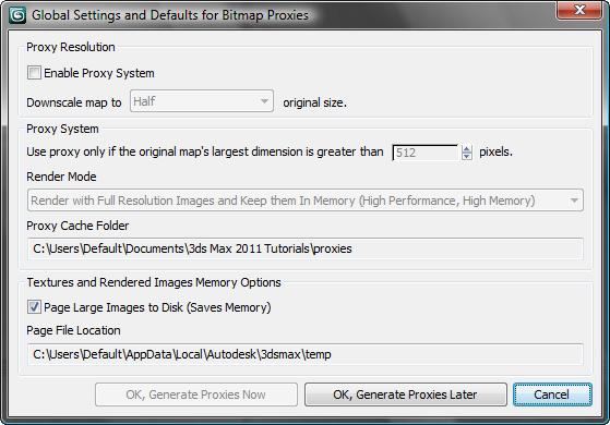 This dialog lets you determine how 3ds Max should create and use proxy versions of bitmaps incorporated in materials. It also lets you disable or enable bitmap paging.