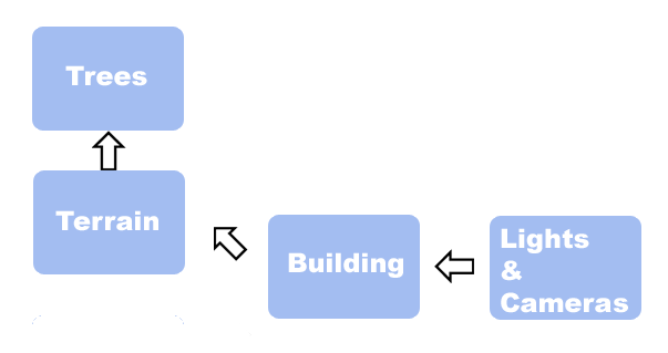 The building scene XRefs the terrain and the plumbing data. The terrain scene XRefs the trees. You decide you are the only one who needs to see the CAD plumbing data. The CAD plumbing data is needed only to line up where the sinks need to be in the building, so you set up the CAD plumbing data XRef to be an overlay. Other scenes that include the building scene won’t see the plumbing. For example, another artist who is responsible for the lighting and cameras sets up an XRef to the building scene. Now the XRef graph looks like this: