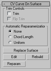 You can edit the CVs in CV curves on surfaces at the Curve CV sub-object level, as you edit other kinds of curve CVs. You can transform CVs in CV curves on surfaces, but you can't move the CVs off the surface. Using the Curve CV sub-object level is an alternative to editing these CVs by using the Edit Curve on Surface dialog.