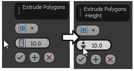 The arrows function the same as with the standard spinner control in 3ds Max. Drag up or down to decrease or increase the value, respectively, or click either arrow to change the value by a small increment. While dragging, right-click to restore the previous value. To increase or decrease the rate of change, Ctrl+drag or Alt+ drag, respectively. You can also right-click the arrows to reset the value to 0 or a reasonable default value, depending on the control.