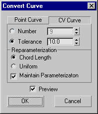 - Choose whether to convert to a point curve or a CV curve. If the curve is already of the type you chose, the settings in this dialog don't convert it, but do change its properties. Default=CV Curve.