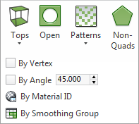 The Select panel includes the Tops, Open, and Patterns tools for sub-object selection at all levels, plus the Hard tool for selecting edges at the borders of smoothing groups and additional selection tools for polygons.