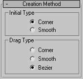 Creation method options for lines are different from other spline tools. You choose options to control the type of vertex created when you click or drag vertices.