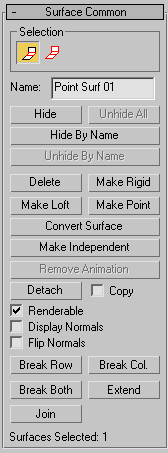This topic describes controls that are common to point surfaces, CV surfaces, and the various dependent surface types. A rollout labeled Surface Common contains the surface sub-object controls for NURBS surfaces. Another rollout, Material Properties, controls mapping on surface sub-objects, and is described in its own topic. See Surface Approximation for a description of that rollout. The final rollout for surface sub-objects depends on the type of surface selected.
