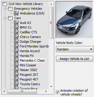 The panel uses the standard vehicle library from Civil View as the source for vehicle meshes, and operates in a similar way to the Civil View Object Placement Style Editor.