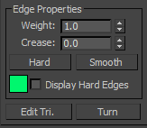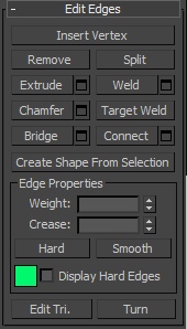 At the Edge sub-object level, you can select single and multiple edges and transform them using standard methods. This topic covers the Edit Geometry and Edit Edges rollouts; for other controls, see Editable Poly.