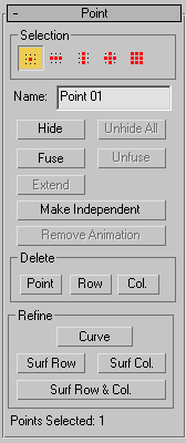 This topic describes the controls for point sub-objects. A rollout labeled Point contains the point sub-object controls for NURBS models. In addition to the Point rollout described here, the Point sub-object level displays the Soft Selection rollout.