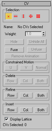 In addition to the CV rollout described here, the Surface CV sub-object level also displays the Soft Selection rollout.