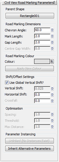 When a road marking is draped across a ground surface, to be visible it must be raised above the underlying surface slightly. The Scene Settings rollout has a global setting for this. Occasionally, individual road-marking objects need to be raised by a greater amount to cater for unusual contours in the underlying ground surface. When this happens, turn off Use Global Vertical Shift, and set a local value.
