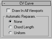 The radio buttons in this group let you specify automatic reparameterization. They are similar to the controls in the Reparameterize dialog, with one addition: all choices except for None tell 3ds Max to reparameterize the curve automatically; that is, whenever you edit it by moving CVs, refining, and so on.