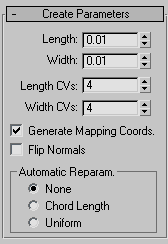 On the Modify panel, the Length and Width spinners are no longer available. You can change the length or width of the surface by scaling the surface at the Surface sub-object level. Moving CV sub-objects also alters the length and width of the surface.