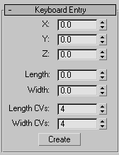 The Keyboard Entry rollout lets you create a CV surface by typing. Use the Tab key to move between the controls on this rollout. To click the Create button from the keyboard, press Enter while the button is active.