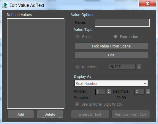 Text can be used to display an object's value, such as its radius, or any value that can be returned from a script or expression. The text in the scene dynamically updates when this value changes.