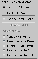 Recalculates the projection direction for the active viewport. Because the direction is initially assigned when you pick the Wrap-To object, if you want to change viewports after assignment, click this button to recalculate the direction based on the new active viewport.