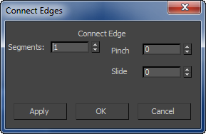 Connecting edges creates new edges between adjacent pairs of selected edges. The Connect Edges settings let you specify the number of new edges, the amount of separation from each other, and their general location.