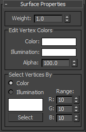 These radio buttons let you choose to select vertices by vertex color value or vertex illumination value. Set the desired options and then click Select.