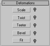 You gain access to loft deformation curves through the Modify panel's Deformations rollout. Deformations are not available in the Create panel. You must open the Modify panel after you’ve lofted to access the Deformations rollout, which offers the following features: