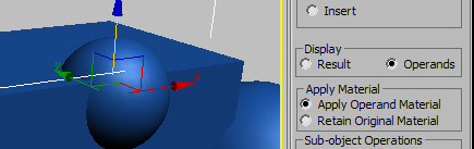 The following illustration shows the difference between the two methods. The Boolean operation starts with a red box and a blue sphere, on the left. The box is used as the base object and the sphere is the subtracted operand. Using the default Apply Operand Material option gives the result shown in the center of the illustration. Choosing Retain Original Material yields the result shown on the right side of the illustration.