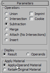ProBoolean provides two options for applying materials, available in the Apply Material group on the Parameters rollout (see above illustration). The default method is Apply Operand Material, which applies the operand material to the resulting faces. The alternative, Retain Original Material, causes the resulting faces to use the material of the first selected object in the Boolean operation.