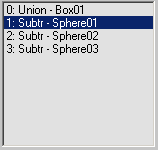The hierarchy view, found at the bottom of the Parameters rollout, displays a list of all of the Boolean operations that define the selected mesh. Each time you perform a new Boolean operation, 3ds Max adds an entry to the list.