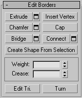 At the editable poly Border sub-object level, you can select single and multiple borders and transform them using standard methods. This topic covers the Edit Geometry and Edit Borders rollouts; for other controls, see Editable Poly.
