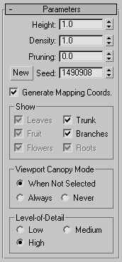 You control height, density, pruning, seed, canopy display, and level of detail. The seed option controls creation of different representations of the same species. You can create millions of variations of the same species, so each object can be unique. With the viewport canopy mode option, you can control the amount of plant detail, reducing the number of vertices and faces 3ds Max uses to display the plant.
