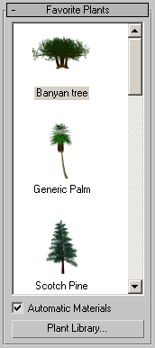 Automatic Materials is on, each plant is assigned its own default material. For more information, see Favorite Plants rollout, following.