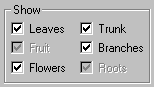 Controls the display of leaves, fruit, flowers, trunk, branches, and roots of plants. Available options depend on the type of plant you select. For example, if a plant doesn’t have fruit, 3ds Max disables that option. Turning off options reduces the number of vertices and faces displayed.