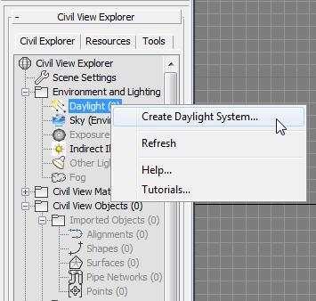 The easiest way to add a Daylight system to your Civil View scene is to right-click the Daylight node on the Civil View Explorer, and choose Create Daylight System.