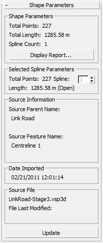 Provides a report on the attributes of with the currently selected spline. Fields show the length of the spline and the number of points (vertices) it has.