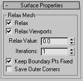 The Relax Mesh controls on the Surface Properties rollout change the apparent surface tension by moving vertices closer to, or away from, their neighbors. The typical result is that the object gets smoother and a little smaller as the vertices move toward an averaged center point. You can see the most pronounced effects on objects with sharp corners and edges.