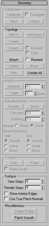 The functions available at the editable patch object level (that is, when no sub-object level is chosen) are also available at all sub-object levels, and work exactly the same at each level.