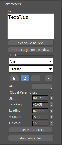 TextPlus provides an all-in-one text object. You can create a spline outline or solid, extruded, beveled geometry. Additional options let you apply different fonts and styles on a per-character basis and add animation and special effects.