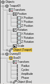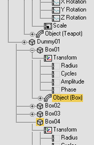 The Ring Array object consists of a dummy object surrounded by a ring of boxes. You can arrange the boxes in the ring along a sine curve, vary their number, and animate the ring array's parameters. You can also replace the boxes with other objects using Track View, as described in the Procedures section, below.