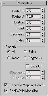 Controls the scaling method used for texture mapped materials that are applied to the object. The scaling values are controlled by the Use Real-World Scale settings found in the applied material's Coordinates rollout. Default=off.
