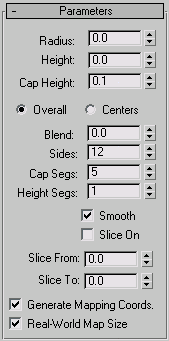Determines what the Height value specifies. Overall specifies the overall height of the object. Centers specifies the height of the midsection of the cylinder, not including its conical caps.