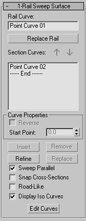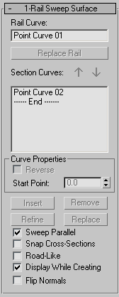 While a 1-rail sweep sub-object is selected, a rollout with the 1-rail sweep parameters appears. This rollout appears only when one 1-rail sweep sub-object is selected. It isn’t possible to edit more than one 1-rail sweep at a time, so unlike some other NURBS sub-objects, the rollout doesn’t appear when multiple 1-rail sweep sub-objects are selected.
