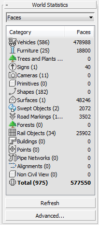 Depending on your choice from the drop-down list, shows the total number of faces or vertices used by each object category.