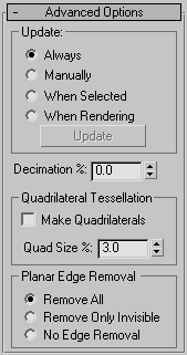 - The percentage of edges to remove from the polygons in the Boolean object, thus reducing the number of polygons. For example, a Decimation % setting of 20.0 removes 20 percent of the polygon edges.