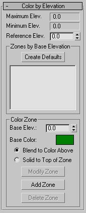 - Creates elevation zones. 3ds Max lists the elevation at the bottom of each zone, referenced to the datum (the reference elevation). 3ds Max applies the color of the zone at the base elevation. Whether the colors blend between zones depends on your choice of the Blend to Color Above or Solid to Top of Zone option.