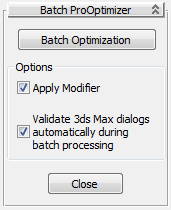 The Batch ProOptimizer rollout contains a couple of options, and also lets you open the Batch Optimization dialog, which contains the main controls for this utility.