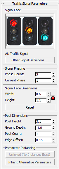 Parametric traffic signals in Civil View use a single sign face map that is divided into a number of separate horizontal segments. By varying the texture coordinates of the sign face geometry, Civil View displays only one of these segments at any moment. This makes it possible to switch between segments of the bitmap to create the illusion that the signal is changing. You can even animate these parameters.
